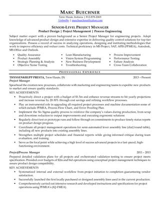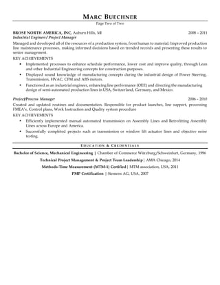 This document summarizes the experience and qualifications of Marc Buechner as a senior-level project manager with over 20 years of experience in product design, project management, and process engineering. He has a proven track record of successfully delivering engineering projects on time and on budget, improving efficiency, reducing costs, and ensuring quality standards. Buechner is proficient in various project management and engineering tools and holds credentials in project management, lean manufacturing, and other related fields. He currently serves as a Project Manager at Thyssenkrupp Presta, where he spearheads new product development initiatives and process improvements.