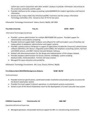 Warren Murphy is seeking an environment where he can use his 25 years of experience in mainframe systems through the latest client server implementations to support and assist a team in achieving their goals. He has experience analyzing projects, designing technical solutions, and training employees. His experience includes positions providing technical support, database administration, and systems analysis for various organizations using technologies such as Linux, AIX, Windows, Oracle, and Informix. He has a Master's degree in Computer and Information Science from Troy University.