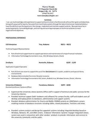 Warren Murphy is an IT professional with over 25 years of experience in systems administration, database administration, technical support, and systems analysis. He has extensive experience supporting a variety of platforms including Linux, AIX, Windows, Oracle, and MySQL. Most recently, he worked as a technical support representative for CGI Enterprises supporting a major financial institution. He holds a Master's degree in Computer and Information Science from Troy University.