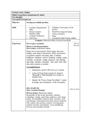 This document is a resume for Nicholas James Malijan. It lists his contact information, objective, skills, work experience, accomplishments, education, and indicates that references are available. Malijan has over 10 years of experience in customer service, data entry, and office administration roles. His most recent experience is as a Phone Center Representative for Press Ganey Associates, where he conducts healthcare surveys by phone and assists with other data entry projects.