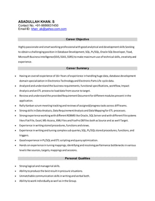Asadullah Khan has over 16 years of experience in database development, ETL processes, SQL, and Oracle. He has strong skills in data analysis, data mapping, and extracting data from various sources for loading into target databases. Some of his key projects include merging large datasets containing over 500 million parts and automating legacy ETL tools. He is proficient in SQL, PL/SQL, Oracle, SQL Server and has experience leading teams and managing projects.