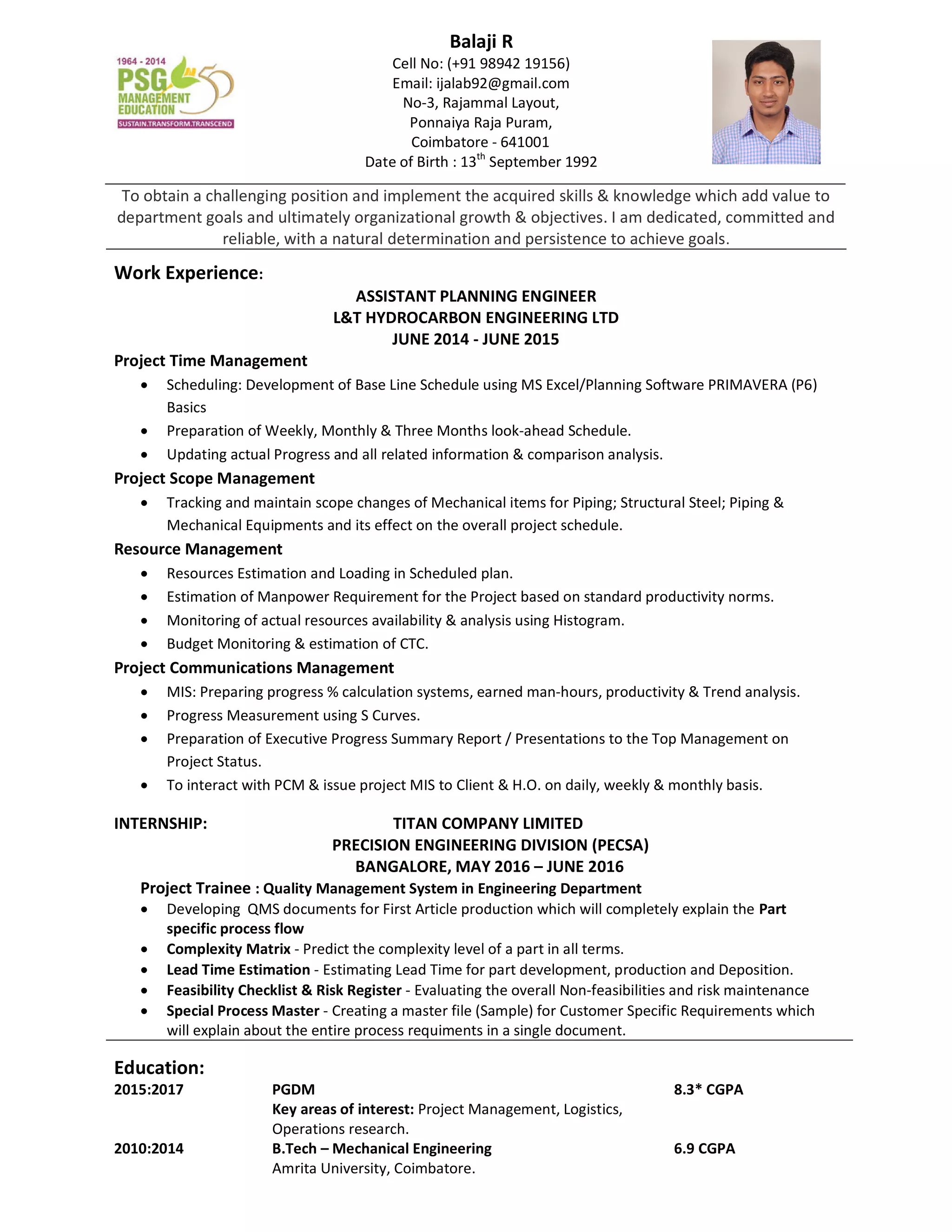 The candidate seeks a challenging position to apply skills and knowledge to contribute to organizational goals. They have over 1 year of experience in project time management, scope management, resource management, and communications at L&T Hydrocarbon Engineering. Additionally, they completed a quality management internship at Titan Company focused on process documentation. The candidate holds a PGDM and B.Tech in Mechanical Engineering with relevant course projects and leadership roles.
