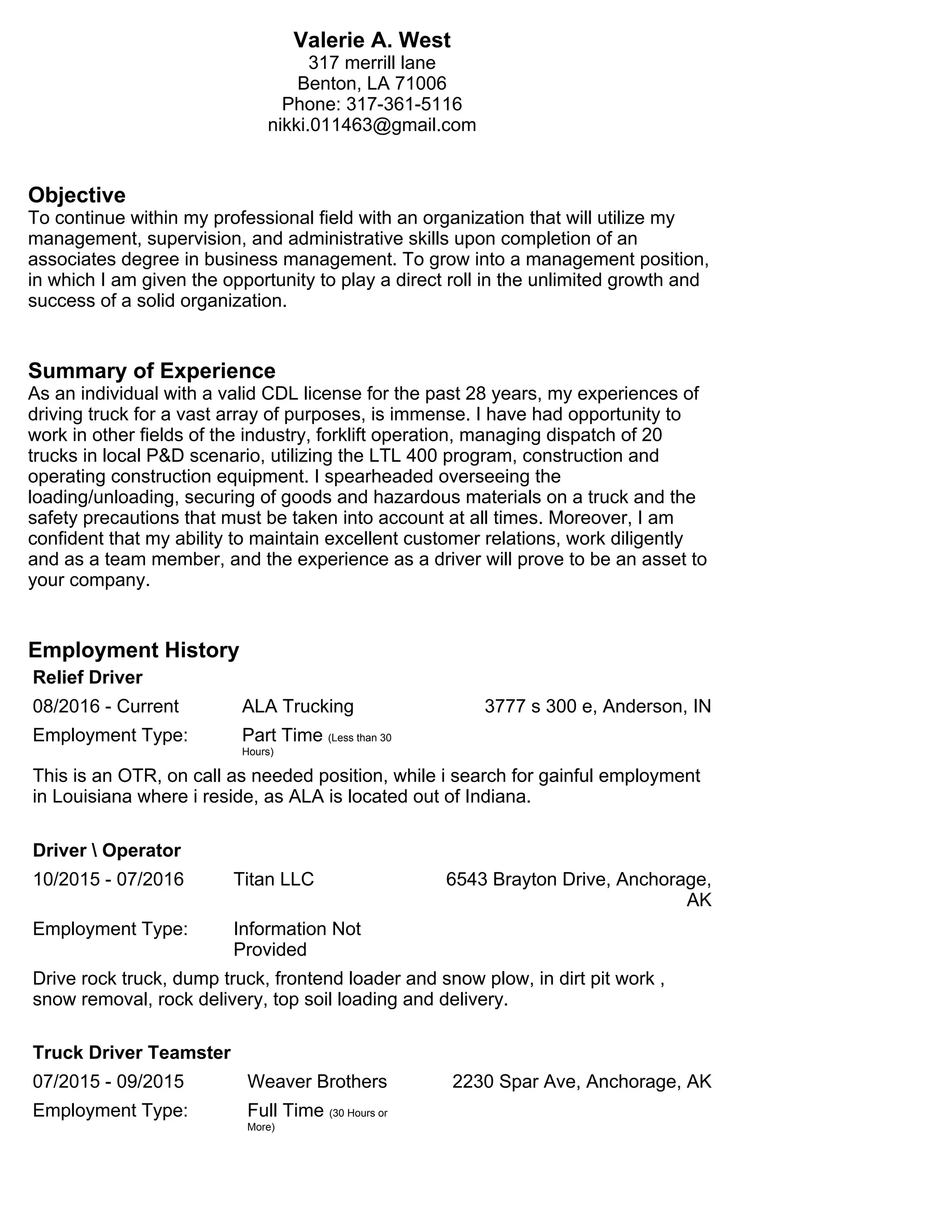 Valerie West is seeking a management position utilizing her 28 years of experience in truck driving and transportation. She has experience driving trucks, operating forklifts, managing dispatch of 20 trucks, overseeing loading/unloading of goods, and maintaining excellent customer relations. Her resume lists her employment history including positions as a relief driver, driver/operator, truck driver teamster, driver/forklift operator, driver/dispatcher, and truck driver over the past 10 years with various companies. She has a Class A CDL, medical examiner's certificate, and TWIC and is currently attending school for an Associate's degree in Business Management.