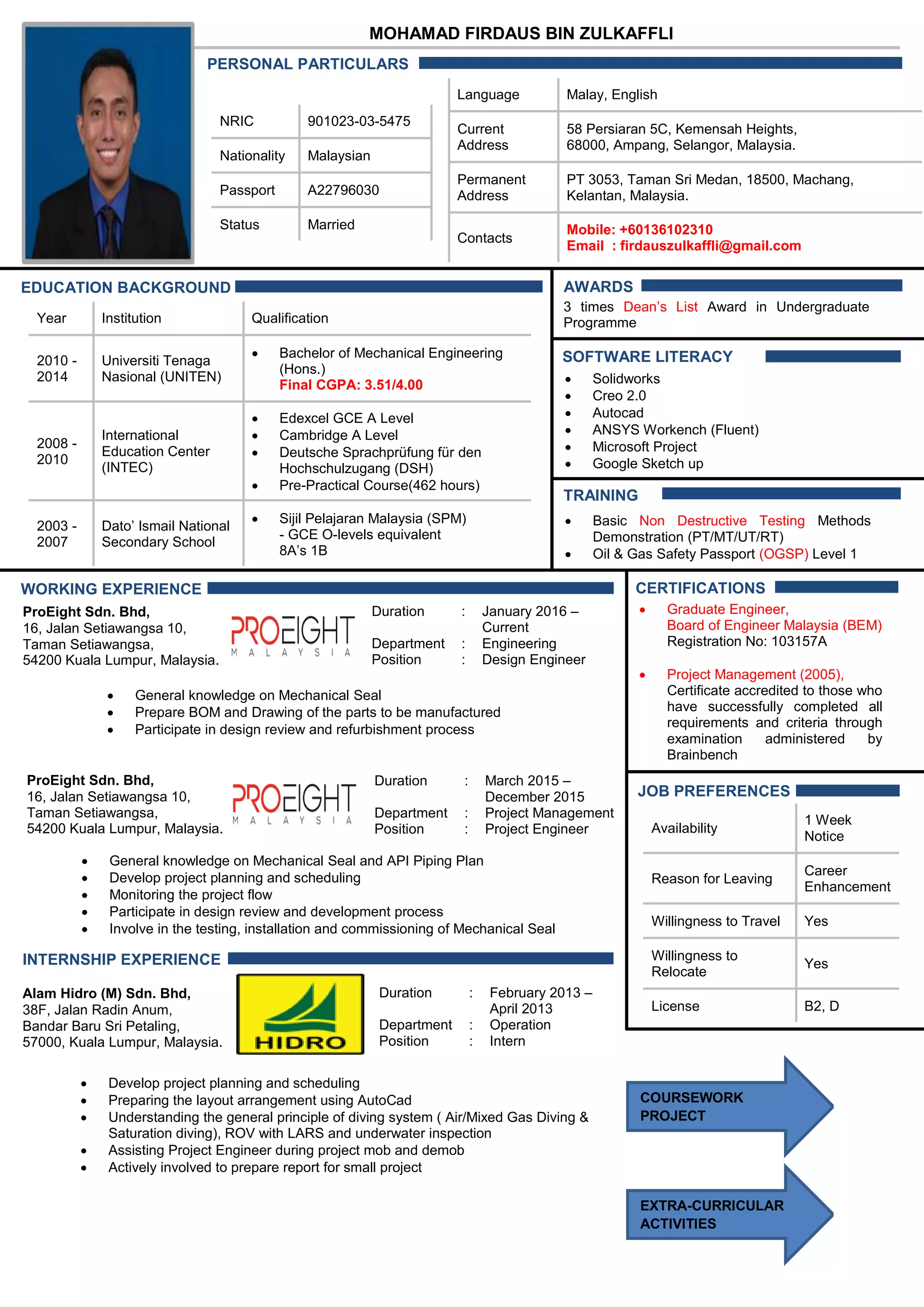 This document contains the resume of Mohamed Firdaus Bin Zulkaffli. It outlines his personal details, education history, skills, internship experience, projects and references. He received a Bachelor's Degree in Mechanical Engineering from Universiti Tenaga Nasional with honors. His internship experiences include projects in engineering design, planning and scheduling. He is currently employed as a Design Engineer focused on mechanical seals.