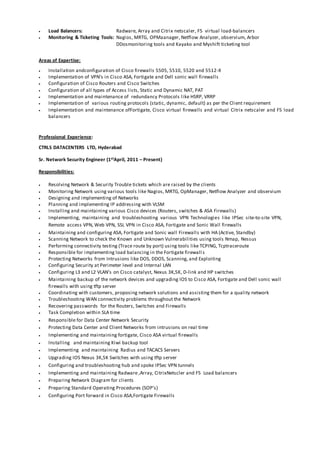 This document is a resume for Dangeti Ganesh. It summarizes his career objective, qualifications, skills, and experience. He has over 9 years of experience in IT network security and is currently a Senior Network Security Engineer at CtrlS Data Centers Ltd in Hyderabad. His expertise includes networking technologies like Cisco routers, switches, and firewalls. He has certifications like CCNA, CCNP, and CCNA Security.