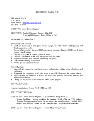 Gary Chu has over 30 years of experience in process engineering. He has worked on numerous projects around the world, holding senior process engineering roles. His experience includes conceptual design, FEED packages, detailed engineering, equipment sizing, process control strategies, and project management. He is proficient in software such as Hysys, Pro/II, HTRI, and Microsoft applications.