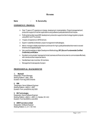 The document is a resume for N. Gurumurthy that summarizes his 17+ years of experience in IT projects. It lists his skills and roles in various projects involving Java/J2EE development, project management, data center migration, and banking/financial software. Key highlights include experience leading teams of 30+ members and successfully managing major projects like data center migrations and application decommissioning.