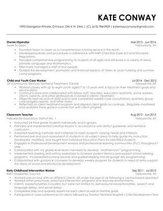 Kate Conway is a qualified Primary/Junior teacher seeking a teaching position. She has over 10 years of experience working with children and youth in various roles, including as a classroom teacher and assistant. She has a Bachelor of Education degree and additional qualifications in Special Education. Kate is passionate about integrating technology into learning and helping all students succeed.
