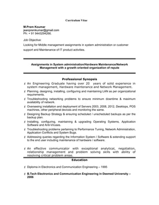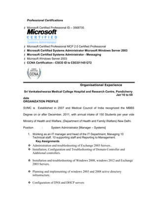 M.Prem Koumar has over 20 years of experience in system administration, hardware maintenance, and network management. He currently works as the System Administrator and Manager of the IT Department at Sri Venkateshwaraa Medical College Hospital and Research Centre in Pondicherry, India, where he oversees 10 technical staff and manages the organization's network infrastructure, servers, and security systems. Prior to his current role, he held positions at Accel Frontline Ltd. and Nexus Computers Ltd., providing customer support and managing networks. He holds several Microsoft and Cisco certifications and aims to take on middle management roles involving system administration or customer support.
