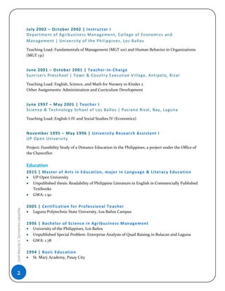 Leah Blescila V. Sarmiento is applying for an Assistant Professor position in the Department of English. She has over 15 years of experience as an English teacher at Christian School International, where she currently serves as the English Coordinator. She has a Master's degree in Education from UP Open University and is a licensed Professional Teacher. She has extensive experience in curriculum development, advising student organizations, and serving on committees.