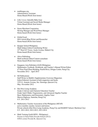 Monica U. Santos is seeking a challenging position that utilizes her experience in education and mathematics. She has a Bachelor's degree in Secondary Education from the Technological Institute of the Philippines and is a licensed teacher in the Philippines. Her areas of experience include teaching mathematics, tutoring, writing/editing educational materials, and various administrative roles. She has worked with several publishers and schools both in-person and remotely.