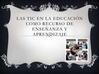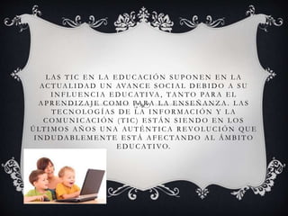 The document discusses the use of information and communication technologies (ICT) in education. It states that ICT is having a revolutionary influence on education by improving both teaching and learning. The use of ICT in education is essential to adapt training to the technological culture that surrounds us. It allows direct access to multiple information sources and the ability to work with different data types through various communication channels. There are diverse tools for using ICT in education, which enable us to digitize information, store our work, automate processes, and maintain interactivity between students and teachers.