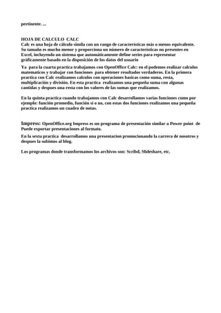 Este documento resume las principales herramientas y funciones del procesador de texto OpenOffice Writer y la hoja de cálculo Calc. Describe las primeras prácticas realizadas con Writer para aprender a formatar texto y con Calc para realizar cálculos matemáticos básicos. También cubre la creación de un blog para compartir archivos y una presentación promocionando la carrera que fue subida al blog.