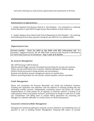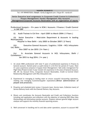 Nanda Kumar has over 11 years of experience in finance, accounts, credit control, and supply chain management. He has a strong background in SAP systems and experience managing teams and client relationships. Currently serving as a senior associate, his roles have included managing accounts receivable, accounts payable, credit, collections, and billing. He holds an MBA in finance and marketing and is skilled in areas like general ledger, financial reporting, and cost analysis.