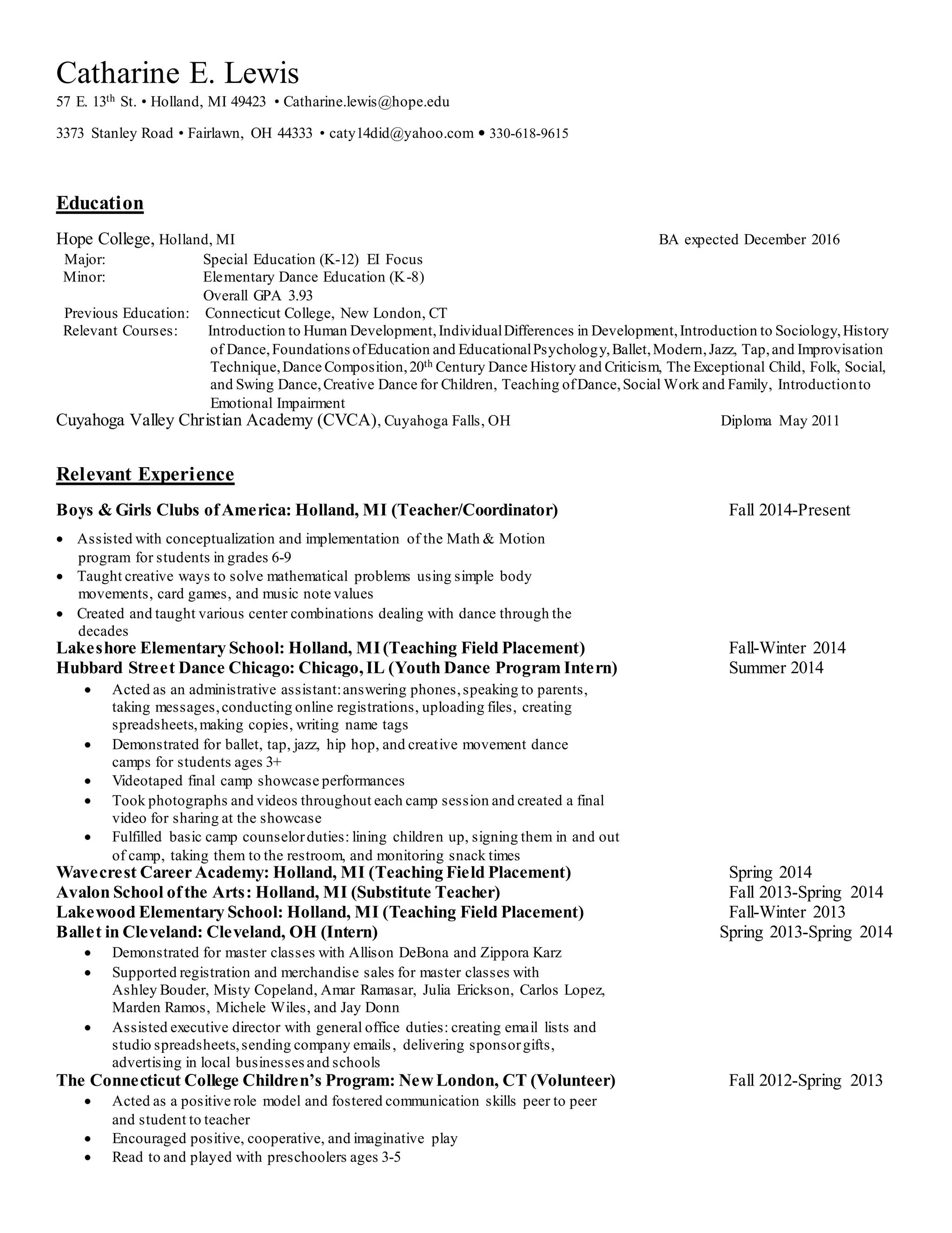 Catharine E. Lewis is a student at Hope College studying special education and dance education. She has a 3.93 GPA and experience teaching dance at various schools and organizations. Her resume outlines her education history at Hope College and Connecticut College, as well as her relevant coursework, certificates, and teaching experiences in both special education and dance.