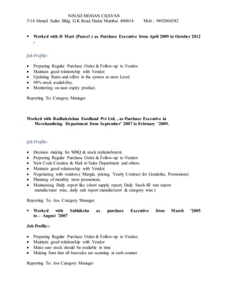 Ninad Mohan Chavan has over 10 years of experience in stock management and procurement roles. He currently works as a Senior Executive at Askmegrocery, where he is responsible for stock management. Previously, he held senior purchase and procurement roles at various retailers like RK Foodland, D Mart, and Radhakrishna Foodland. In these roles, he was responsible for activities like purchase order generation, vendor negotiation, stock availability, and supply chain management. He holds a B.Com degree from Mumbai University and has also attended various training programs to enhance his skills.