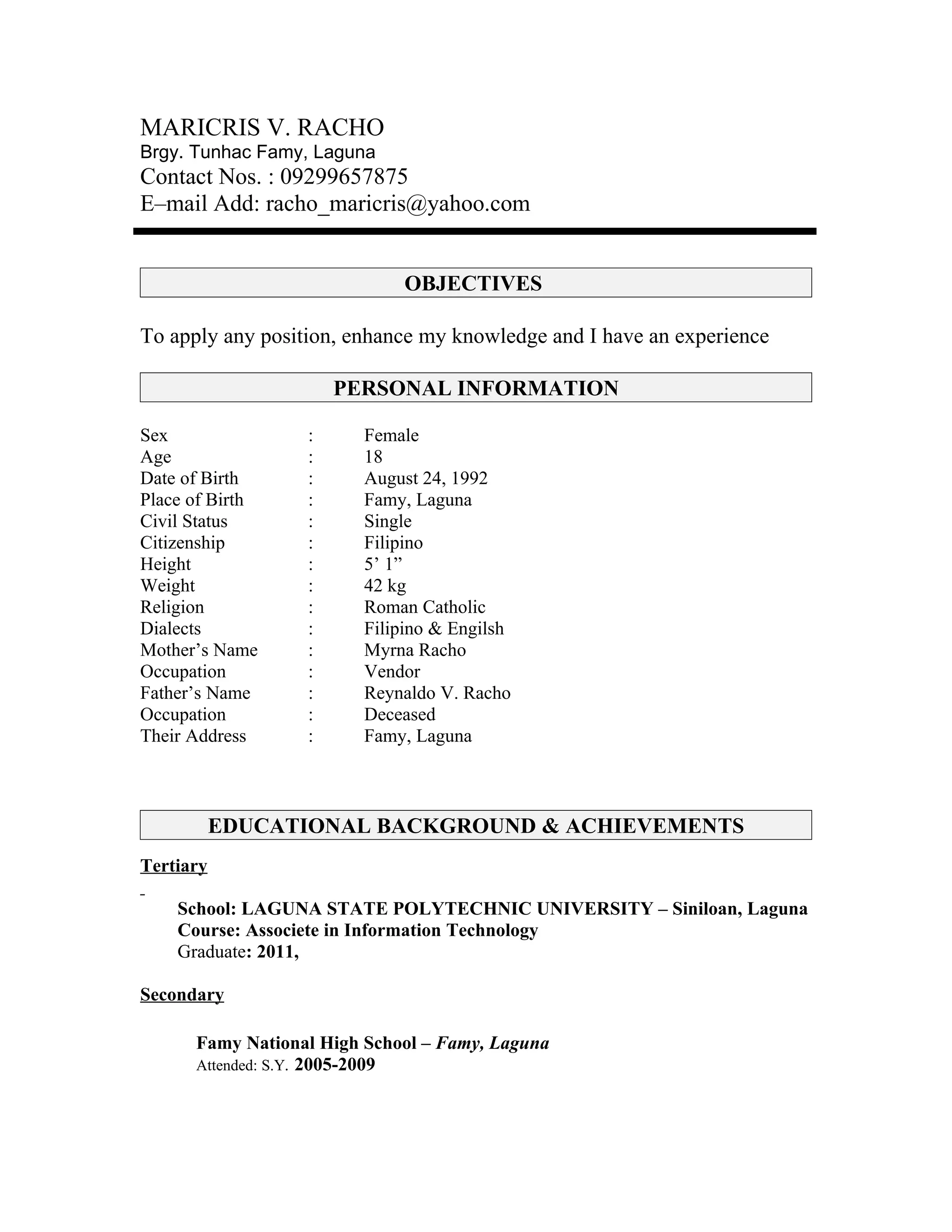 This document is a resume for Maricris V. Racho from Brgy. Tunhac Famy, Laguna. It includes personal details such as her name, age, address, education history and qualifications. She graduated in 2011 with an Associate in Information Technology degree from Laguna State Polytechnic University - Siniloan. Her skills include proficiency with Microsoft Office applications and networking. References are provided from her university and local community leaders.