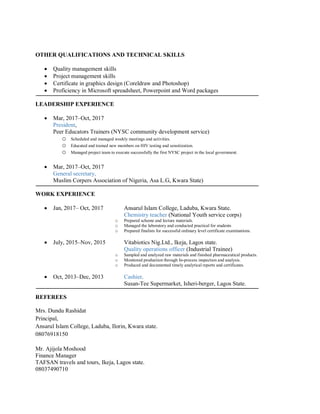 This document is a resume for Sebiotimo Rasheed Ayobami, seeking an entry-level position. It summarizes his educational and professional background. He has a B.Tech in Biochemistry from Federal University of Technology, Akure and training in quality assurance and quality control. His work experience includes teaching chemistry, working as a quality operations officer for a pharmaceutical company, and a cashier role. He has leadership experience as president of a peer educator group and general secretary of a Muslim association. His skills include analytical ability, problem solving, communication, and quality management.
