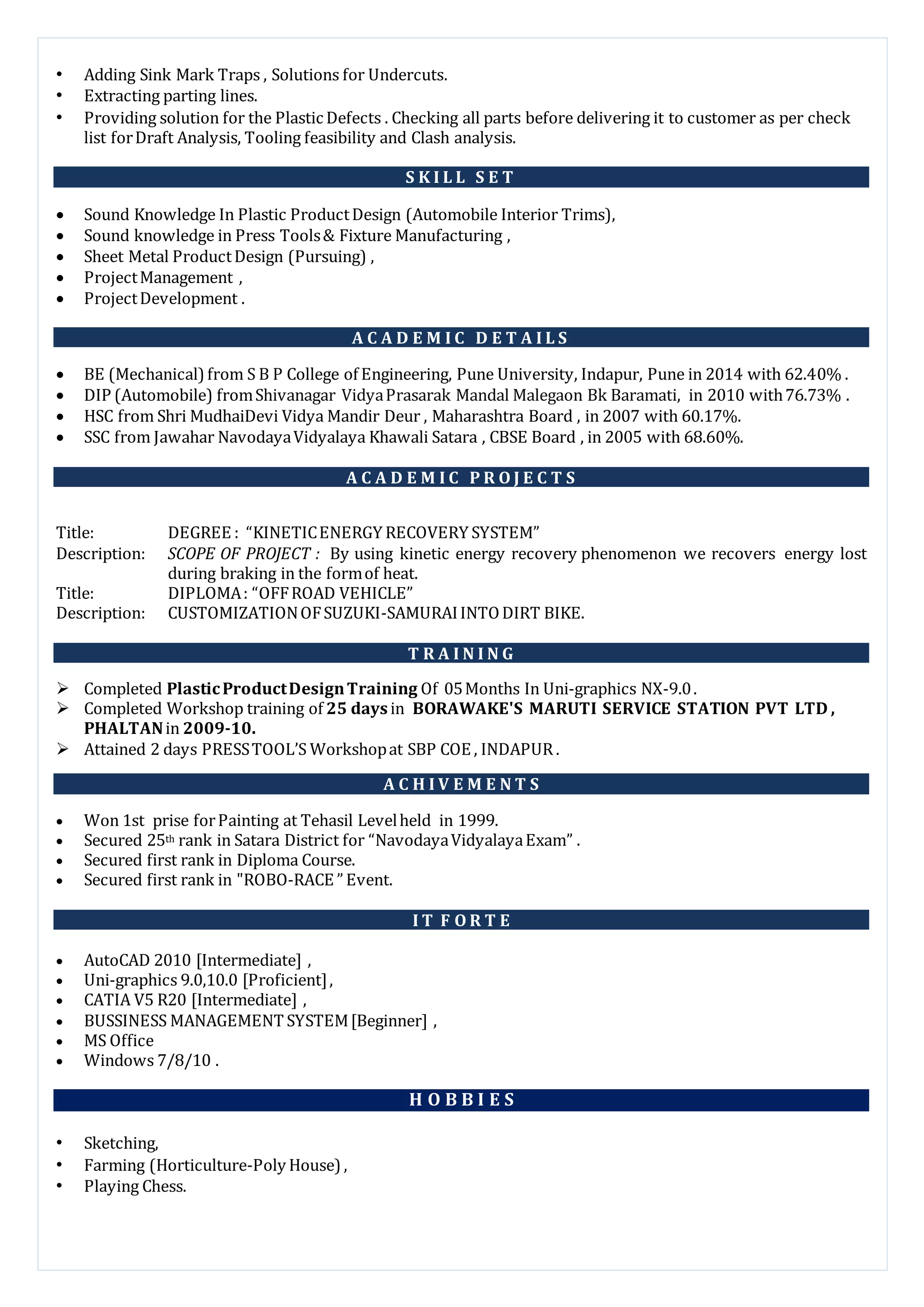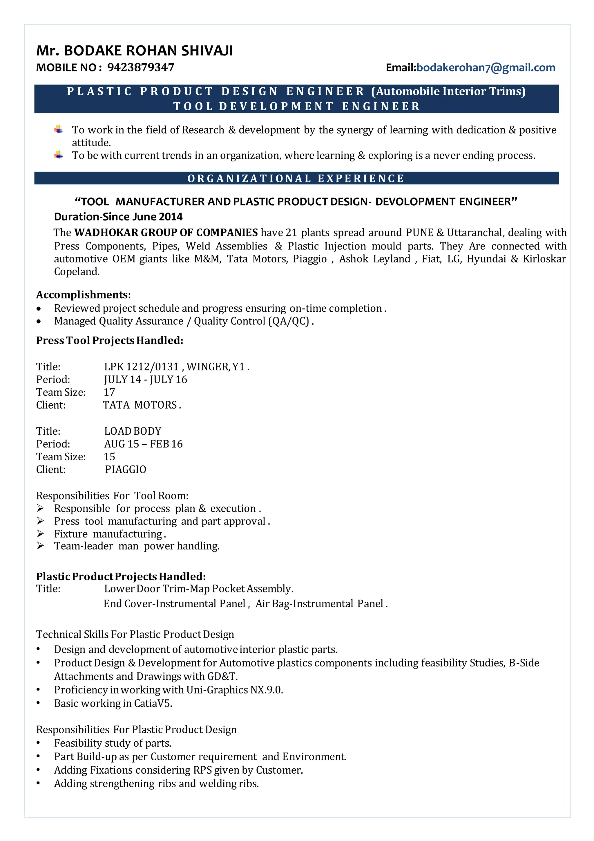 Mr. Bodake Rohan Shivaji is seeking a role in plastic product design and tool development engineering. He has over 5 years of experience in tool manufacturing and plastic product design for automotive components. He is proficient in Unigraphics NX.9.0 and has intermediate skills in AutoCAD, CATIA V5, and business management systems. He holds a BE in Mechanical Engineering and a diploma in Automobile Engineering.