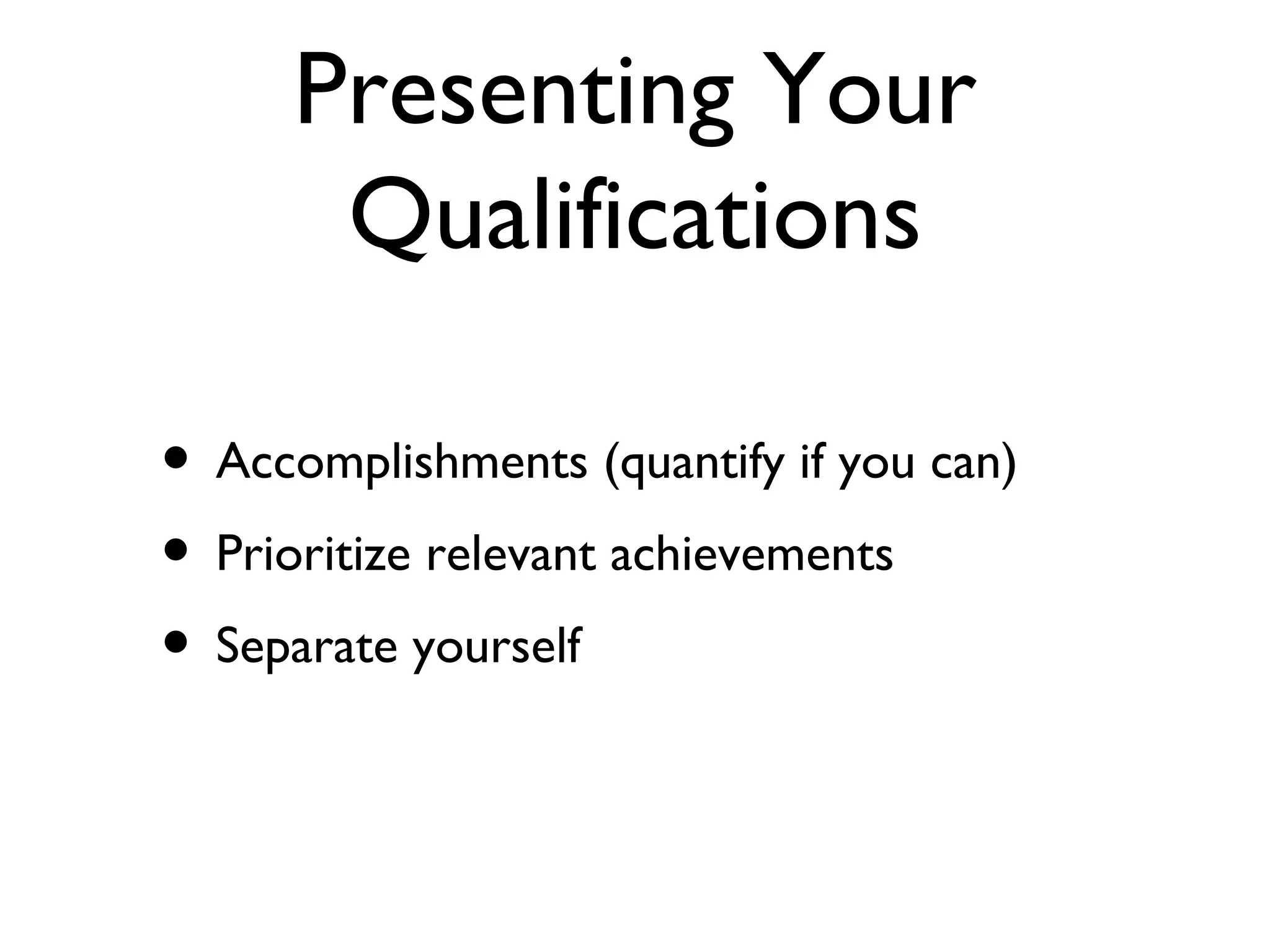 This document provides guidance on creating résumés in 3 main sections. It discusses presenting qualifications and accomplishments, the different types of résumés including chronological and skills-based, and details on layout, typesetting and proofreading. Key recommendations include quantifying accomplishments, using action verbs, keeping the résumé to 1-2 pages with no unnecessary information, and carefully checking for errors.