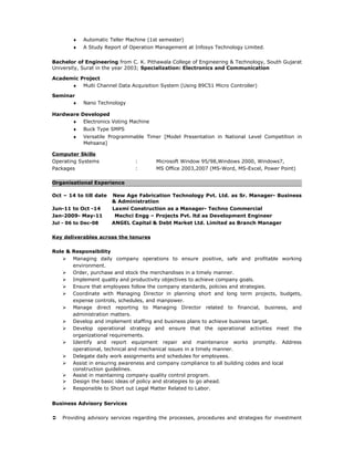 This document contains a resume for Sandip Nayak. It summarizes his professional experience, qualifications, skills, and objectives. Nayak has over 9 years of experience in construction management and business administration. He currently works as a Senior Manager of Business and Administration at New Age Fabrication Technology Pvt Ltd. Nayak holds an MBA in Finance and a Bachelor's degree in Electronics and Communication Engineering. He aims to take on a challenging position in the hi-tech industry where he can help the company grow and develop his career.