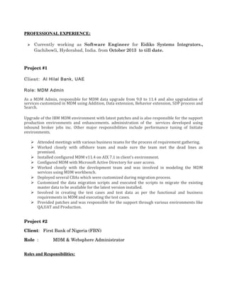 This document contains a summary of Vikranth Govindugari's skills and professional experience working with IBM middleware products like Infosphere MDM and WebSphere Application Server. He has over 3 years of experience installing, configuring, and administering these products. Some of his responsibilities include upgrading MDM environments, developing MDM services, migrating master data, and providing production support. He has worked on projects for clients in the banking industry in UAE, Nigeria, and the UAE.