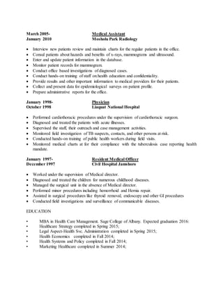 Rubi Usha Sarecha is seeking a position in healthcare. She has over 15 years of experience working in medical roles in Pakistan and as a medical assistant in the United States. Currently, she is interning at Angiodynamics in healthcare economics and sales where she works on projects and market access for medical devices. She is pursuing an MBA in healthcare management from Sage College expected to graduate in 2016.