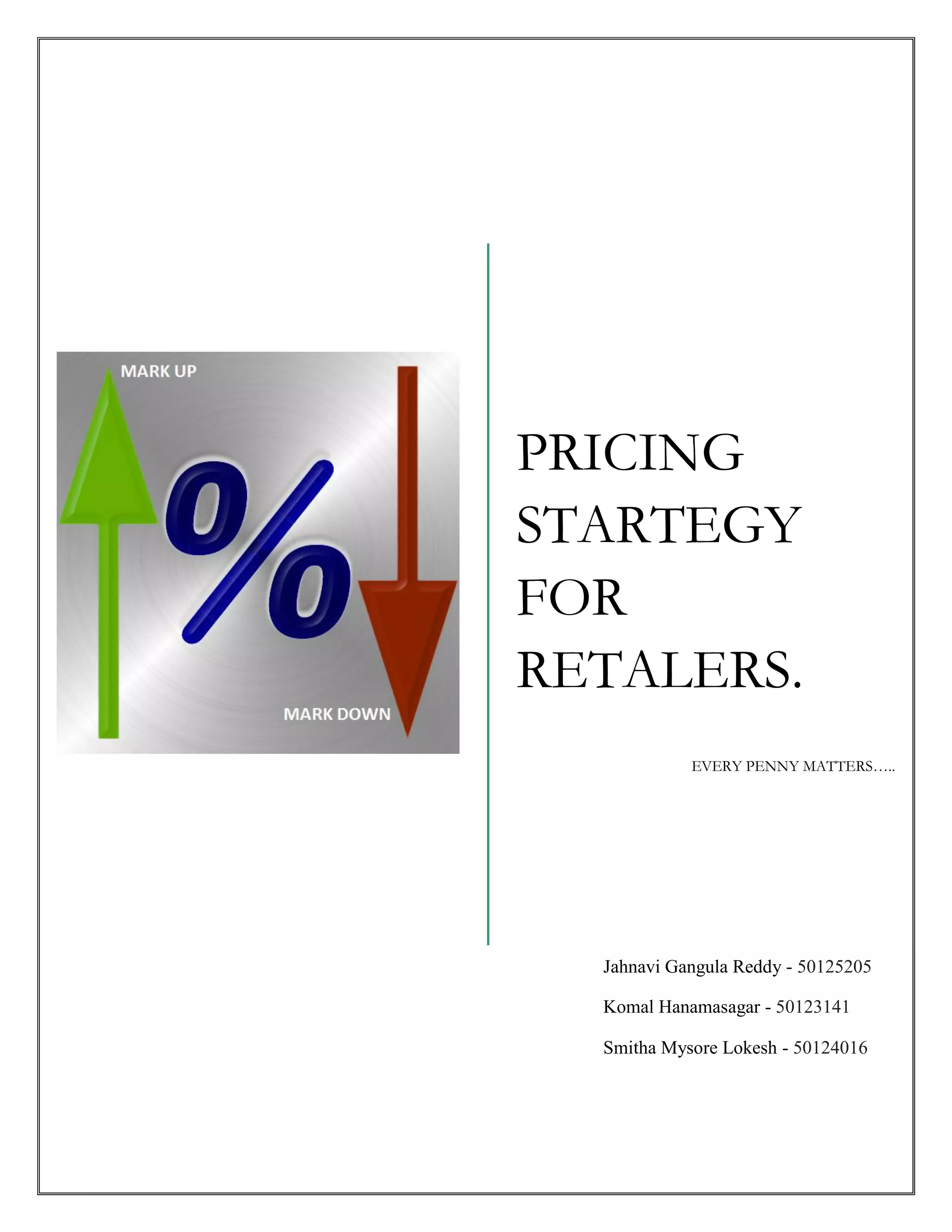 This document discusses pricing strategies for retailers. It proposes building a data warehouse to analyze pricing strategies like markups and markdowns. The data warehouse would help optimize these strategies to maximize profits. Key aspects discussed include extracting data from various sources, cleaning and transforming the data, then loading it into dimensional models. Visualizations would then help analyze inventory and sales data to make informed decisions around pricing slow and fast moving goods.
