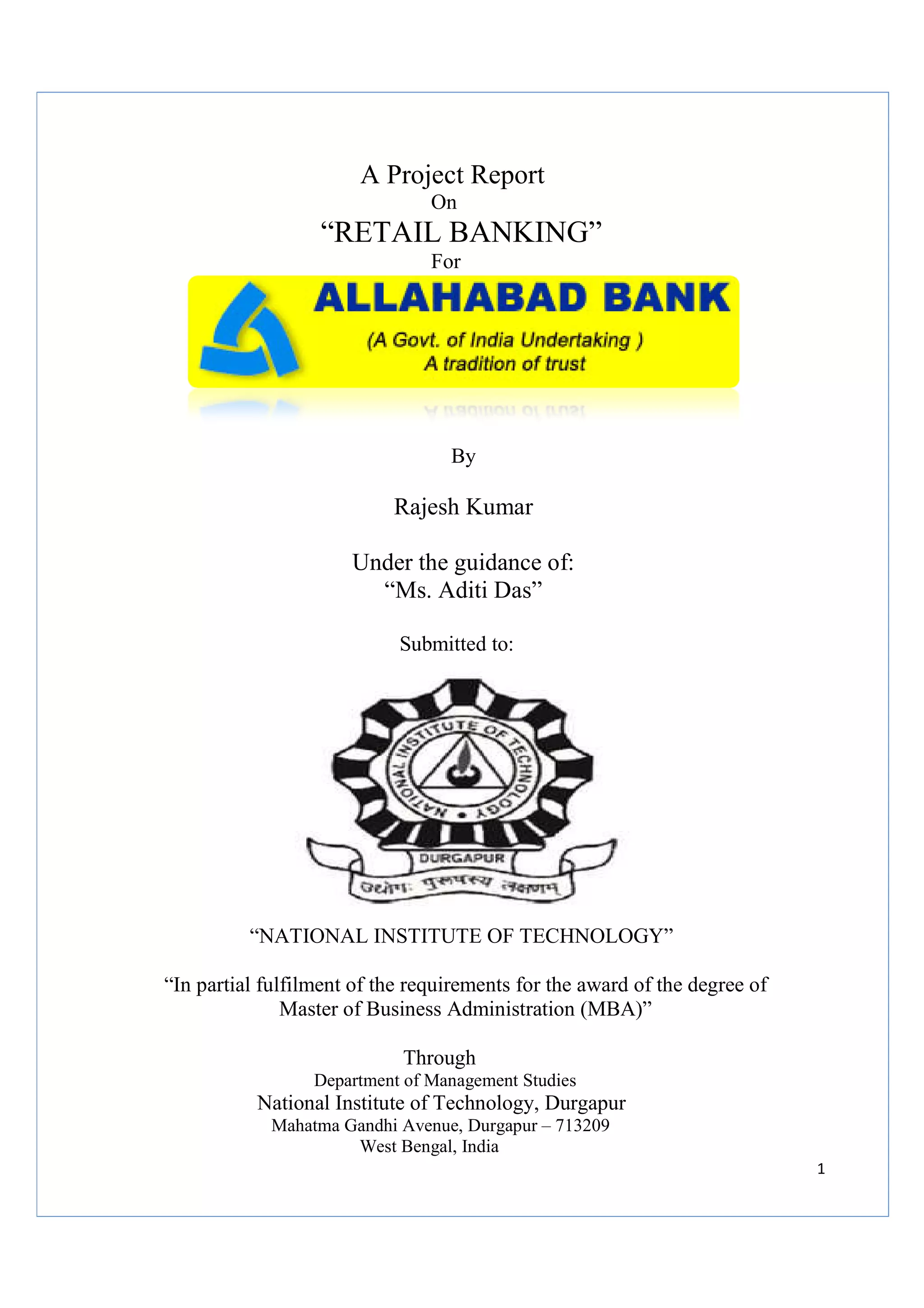 The document is a project report submitted by Rajesh Kumar to the National Institute of Technology on retail banking with reference to Allahabad Bank. It includes an executive summary, introduction, company and industry profiles, data collection methodology, findings, suggestions and conclusions. The report analyzes various aspects of Allahabad Bank's retail banking operations including its products and services, workflow, McKinsey's 7S framework, research methodology and customer feedback.
