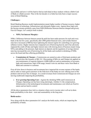 Retail banking in India has experienced high growth in the past decade but now faces challenges constraining further growth. Key issues include declining net interest margins and fees as well as rising operating costs. Additional bottlenecks are customer saturation in urban areas, high numbers of inactive accounts, low customer loyalty leading to switching between banks, and competition from non-banking entities. To address these, banks need to improve delivery and experience through initiatives like relationship-based pricing and response times, 24/7 service availability, faster complaint resolution, and loyalty programs rewarding long-term customers. Banks should also explore new business models to profitably serve rural markets and redefine investment advisory services to directly advise customers.