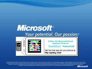 This document summarizes Microsoft Online Services for Retail which aims to connect deskless retail workers to the right information through cloud-based solutions. It discusses challenges retail businesses face around operational performance, security, workforce connectivity and real-time data access. The solution presented is Business Productivity Online Suite and Deskless Worker Suite which provide productivity and collaboration tools to both deskless and desk-based workers through a browser or mobile devices. Case studies are presented on how the tools improved communication and productivity at Blockbuster.