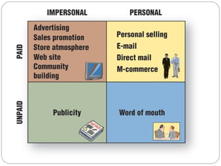The document discusses retail communication mix and methods used by retailers to communicate with customers. It covers the key functions of retail promotion programs which are to inform, persuade and remind customers. It then discusses various communication methods including paid impersonal communication like advertising, paid personal communication through salespeople, unpaid impersonal communication through publicity, and unpaid personal communication through word-of-mouth. The document also covers types of retail promotions like price promotions, premiums, coupons, sampling and various in-store promotion techniques.