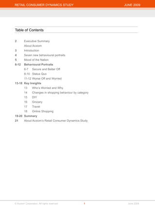 The Retail Consumer Dynamics Study from June 2009 reveals how UK consumers have altered their buying behaviors due to the economic climate, identifying seven distinct consumer groups based on attitudes and financial stress. Acxiom's insights provide value for retailers by illustrating shifts in consumer moods and spending tendencies and enabling tailored marketing strategies. The findings highlight the necessity for retailers to adapt to these changes in order to effectively connect with and retain customers amidst a challenging economic landscape.
