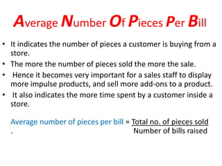 - Average number of pieces per bill indicates the number of items customers buy per transaction. More impulse items and add-ons can increase this.
