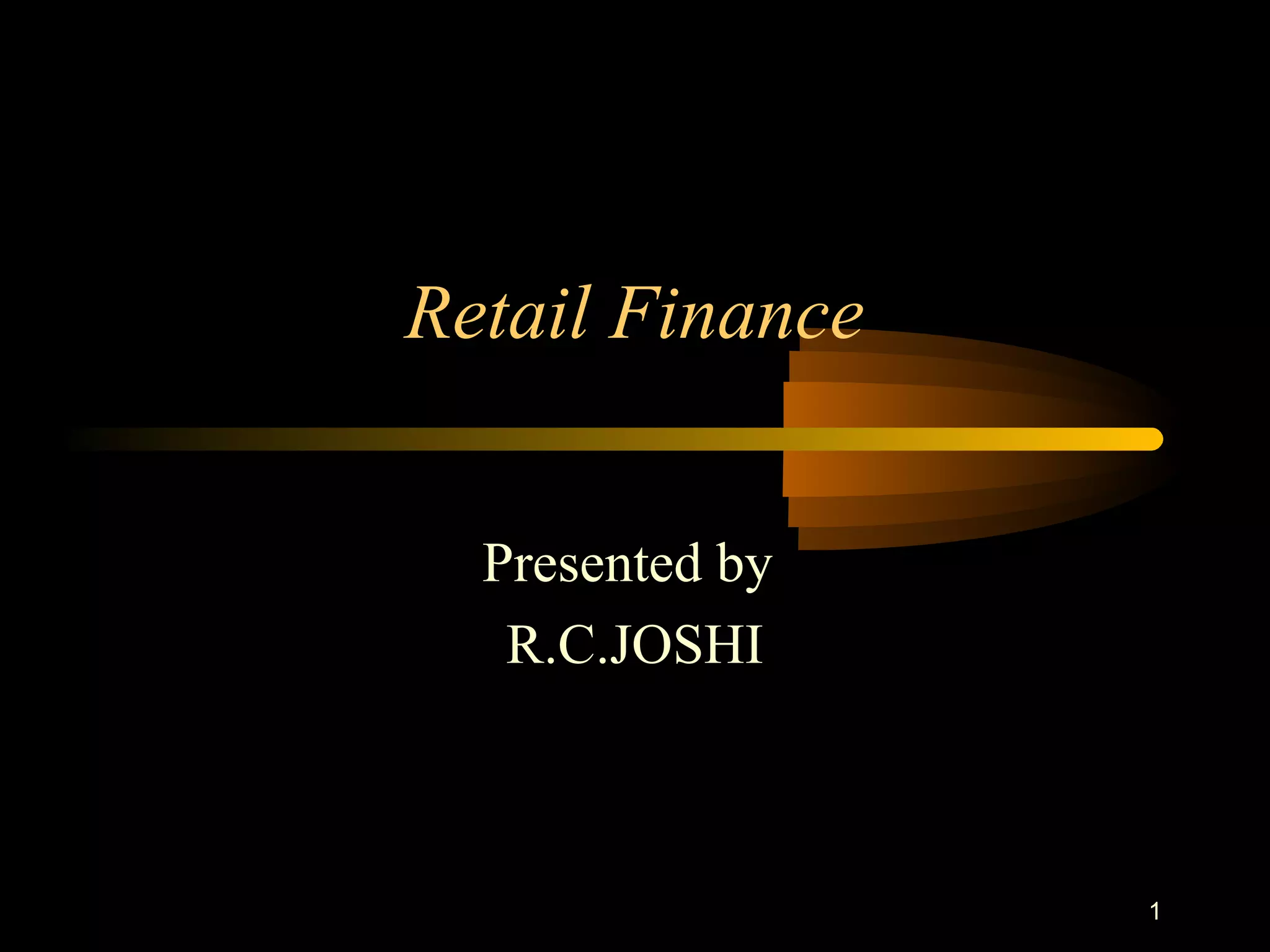 This document discusses the growth of retail finance in India. It notes that retail banking has expanded its scope and become a prominent part of bank balance sheets. Banks now offer a wide range of loan products to retail customers. Housing loans and auto loans have seen particularly strong growth. Overall, retail advances for banks grew 41.2% in 2004-05. Retail finance is seen as having significant potential for further expansion given India's growing middle class and low existing penetration rates. However, regulators have expressed some concerns about the rapid growth rates in certain retail segments like housing.