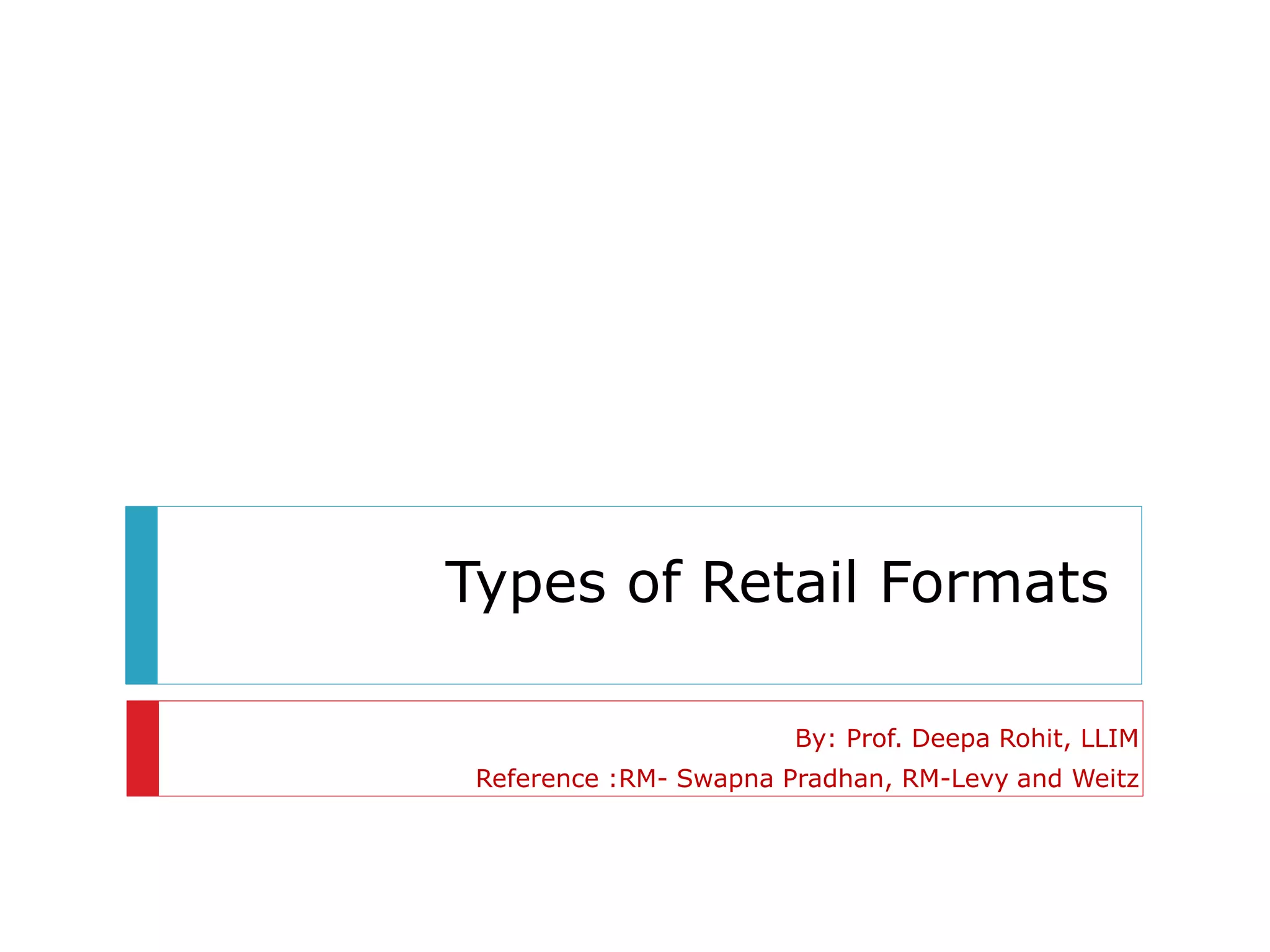 The document discusses different types of retail formats. It describes store-based formats like convenience stores, supermarkets, hypermarkets, department stores, and specialty stores. It also covers non-store formats such as direct selling, mail order, and telemarketing. The key factors used to classify retailers are ownership type (independent, chain, franchise), merchandise offered (food, general goods), and target market (mass, exclusive). Larger store formats that have emerged over time are also explained, such as superstores, combination stores, and big box retailers.