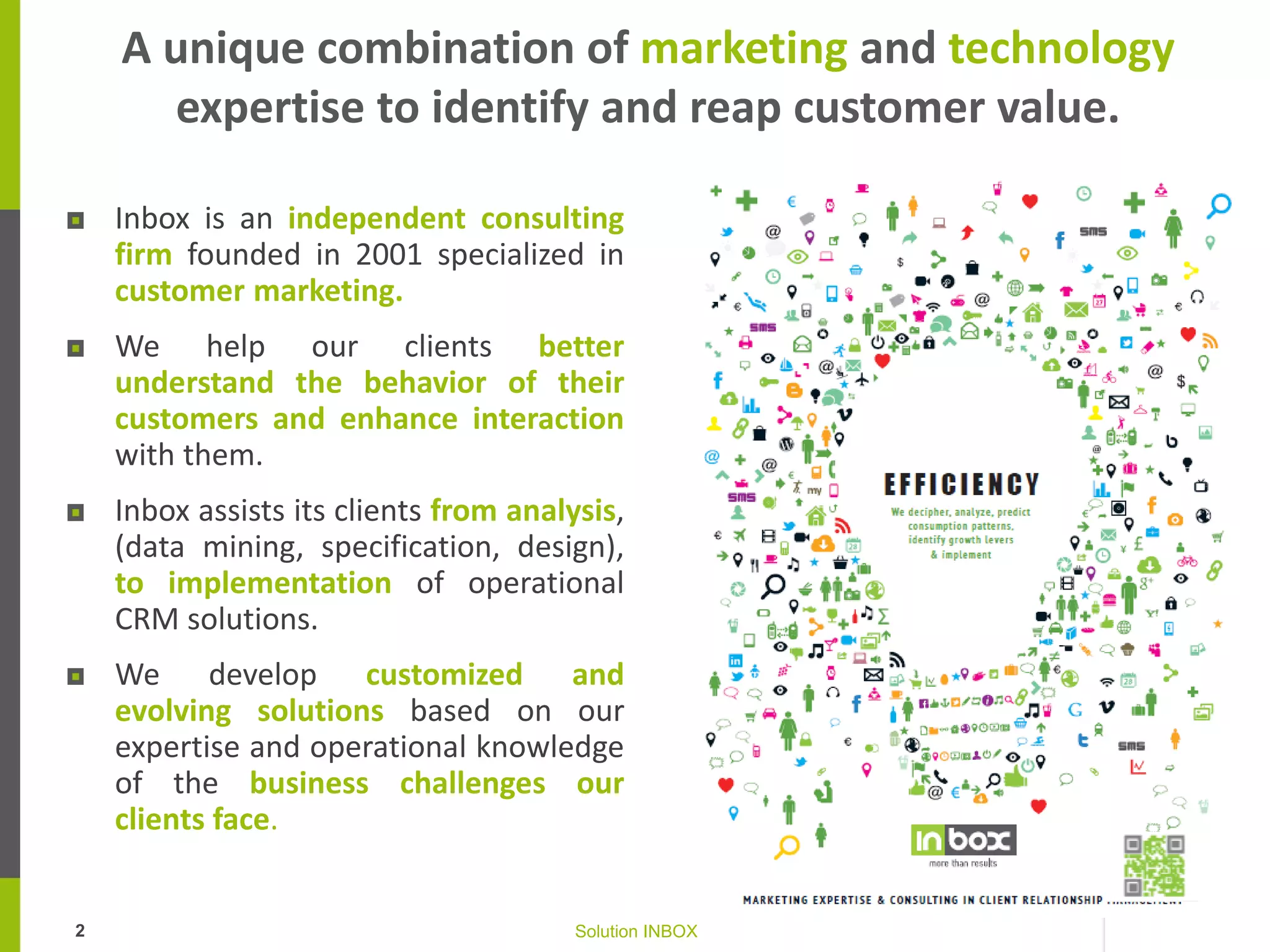 Inbox is an independent consulting firm specializing in customer relationship management (CRM) since 2001, focusing on leveraging marketing and data analytics to enhance customer value and interaction. The firm operates in multiple countries and emphasizes tailored CRM solutions that address business challenges, and maintain high client satisfaction rates. Key strategies include understanding consumer behavior, optimizing campaigns, and developing loyalty programs to increase customer retention and engagement.