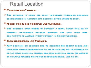 The document discusses factors to consider when selecting a retail location. It outlines that consumer choice and competitive advantage are important considerations. Any location decision must account for trends in transportation and shopping behaviors. Developing a retail site requires high investment and long lead times. Selecting the right property is important as it can be a major company asset. There are also declining opportunities for new development sites. The document then discusses specific factors like accessibility, visibility, traffic patterns, and infrastructure that affect attractiveness of potential locations.