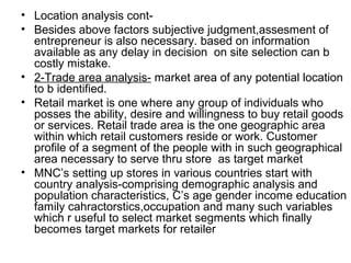 Retail location is an important strategic consideration for competitive advantage. Key factors in choosing a location include proximity to customers, market potential based on demographics, competition, and infrastructure accessibility. A multi-step process analyzes the target market and trade area, evaluates suitable locations based on these factors, and selects the optimal site. Location influences merchandise, layout, and is integral to long-term retail strategy even with e-commerce growth.