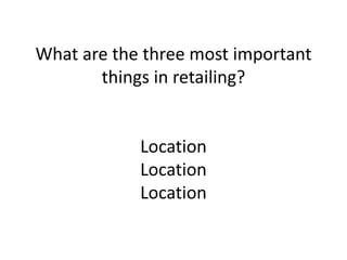 The document discusses the importance of location in retailing. Location is the prime consideration for customers and a strategic decision for competitive advantage, though it involves substantial investment and risk. There are three basic types of locations: free standing, city/town business districts, and shopping centres. Evaluation criteria for locations include trade area size, occupancy costs, traffic, and restrictions. Unplanned areas include free standing stores and urban locations, while shopping centres range from neighbourhood centres to enclosed malls to lifestyle centres. The type of location chosen must reinforce the retailer's strategy and target market's shopping behavior.