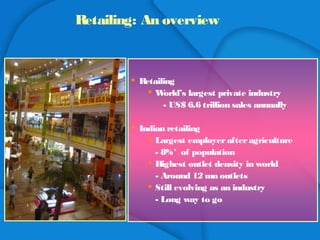 The retail supply chain is a large and evolving industry globally and in India. Retail formats have evolved from traditional village markets to modern convenience stores, supermarkets, hypermarkets, and shopping malls. There are over 12 million retail outlets in India, making it one of the most densely populated retail markets. Emerging technologies like RFID and information systems are becoming the backbone of retail supply chain operations by automating processes, increasing visibility and efficiency, and reducing costs. For example, Walmart estimated potential annual savings of $8.35 billion from implementing RFID across its supply chain through benefits like reduced inventory levels, shrinkage, and labor costs.