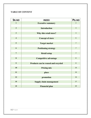 This document proposes a retail store concept called "Get Best from Waste" that sells reusable and recyclable household products created from waste materials. The store aims to promote reducing, reusing and recycling. It will target all age groups and use viral marketing. Products will be creatively designed and the store interior will have an historic feel using waste materials. The financial plan estimates initial costs of around $348,500 for rent, deposits, furniture, equipment and labor over the first 2 months.