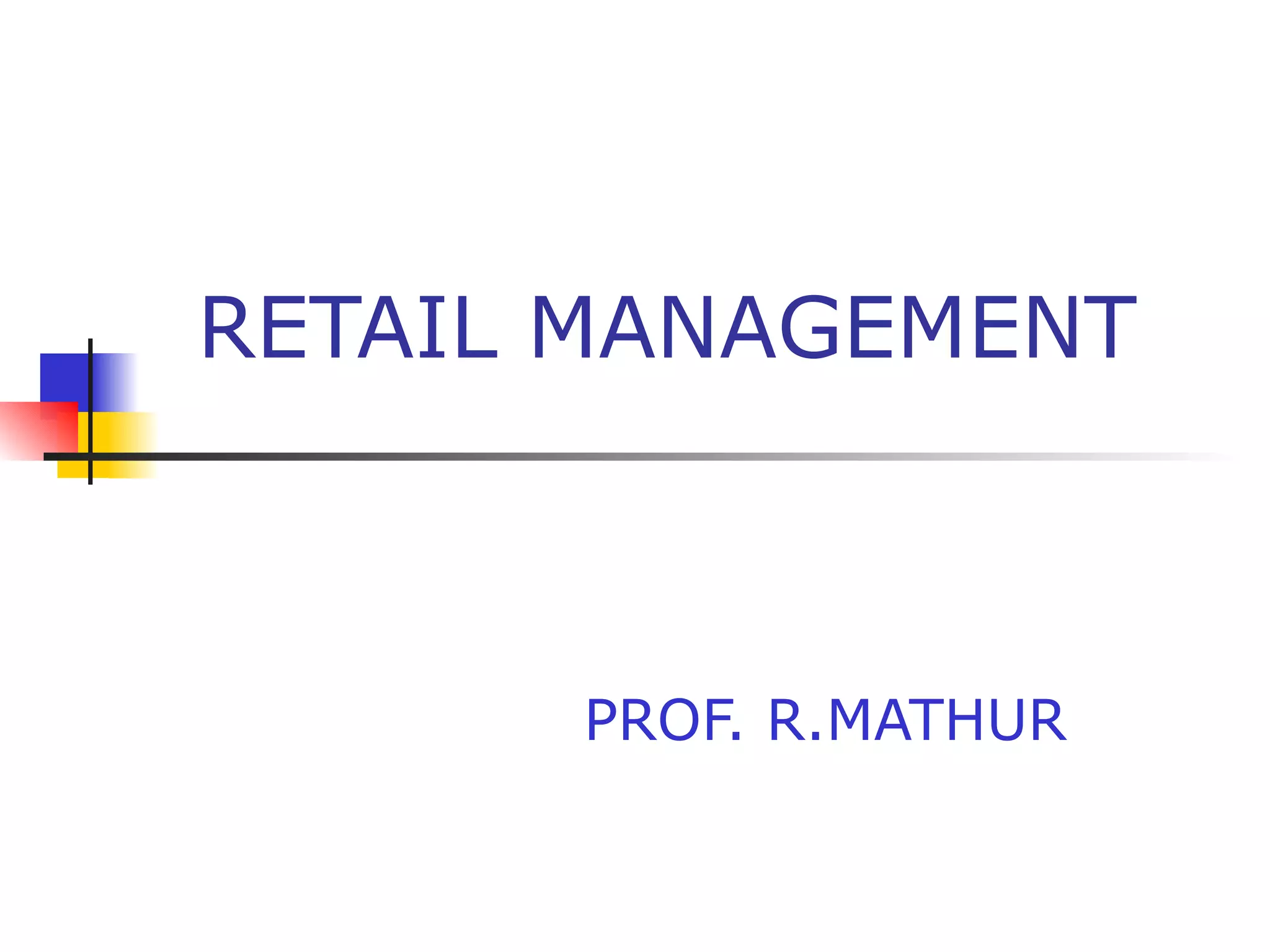 The document discusses concepts in retail management. It begins by defining retailing as the sale of goods and services to consumers for personal use. It then discusses the role of retailers in linking producers to customers. Organized retailing makes up only 2% of the Indian retail sector currently but is growing rapidly. Factors like rising incomes and lifestyle changes are contributing to the growth of organized retail formats in India. The retail environment in India differs from western countries in aspects like urban congestion and rural populations.