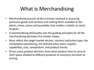 Merchandising involves acquiring goods and making them available to customers at the right times, prices and quantities to meet retailer goals. A merchandising philosophy guides product decisions based on the target market, competitors, and trends. Effective merchandising requires planning assortments, inventory levels, pricing, and more to sell the right products profitably. Retailers must determine their merchandising strategy in terms of brand offerings, product breadth and depth to meet customer needs within budget.