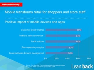 A survey of 156 retail executives reveals that mobile devices and apps significantly impact customer loyalty, sales conversion, and operational margins. While 75% predict positive effects on business results over the next three years, only one-third consider themselves leaders in mobile technology adoption. Many retailers acknowledge lagging behind their omnichannel competitors despite recognizing the importance of creating a seamless mobile shopping experience.