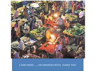 The document discusses the growth of retail sector in India from 1997-2010. It notes that traditionally, most Indian shopping took place in small, independent shops with limited product selection and pricing transparency. However, from 1997-2010, India's retail market grew significantly in size and modern organized retailers began establishing a presence in large urban areas, though they still only accounted for 4% of the market. The entry of large multinational retailers sparked debate around job losses for small shops but studies found limited impact. The document outlines many major Indian and international retailers operating in India and the formats they use. It also discusses some challenges faced by the emerging organized retail sector in India.