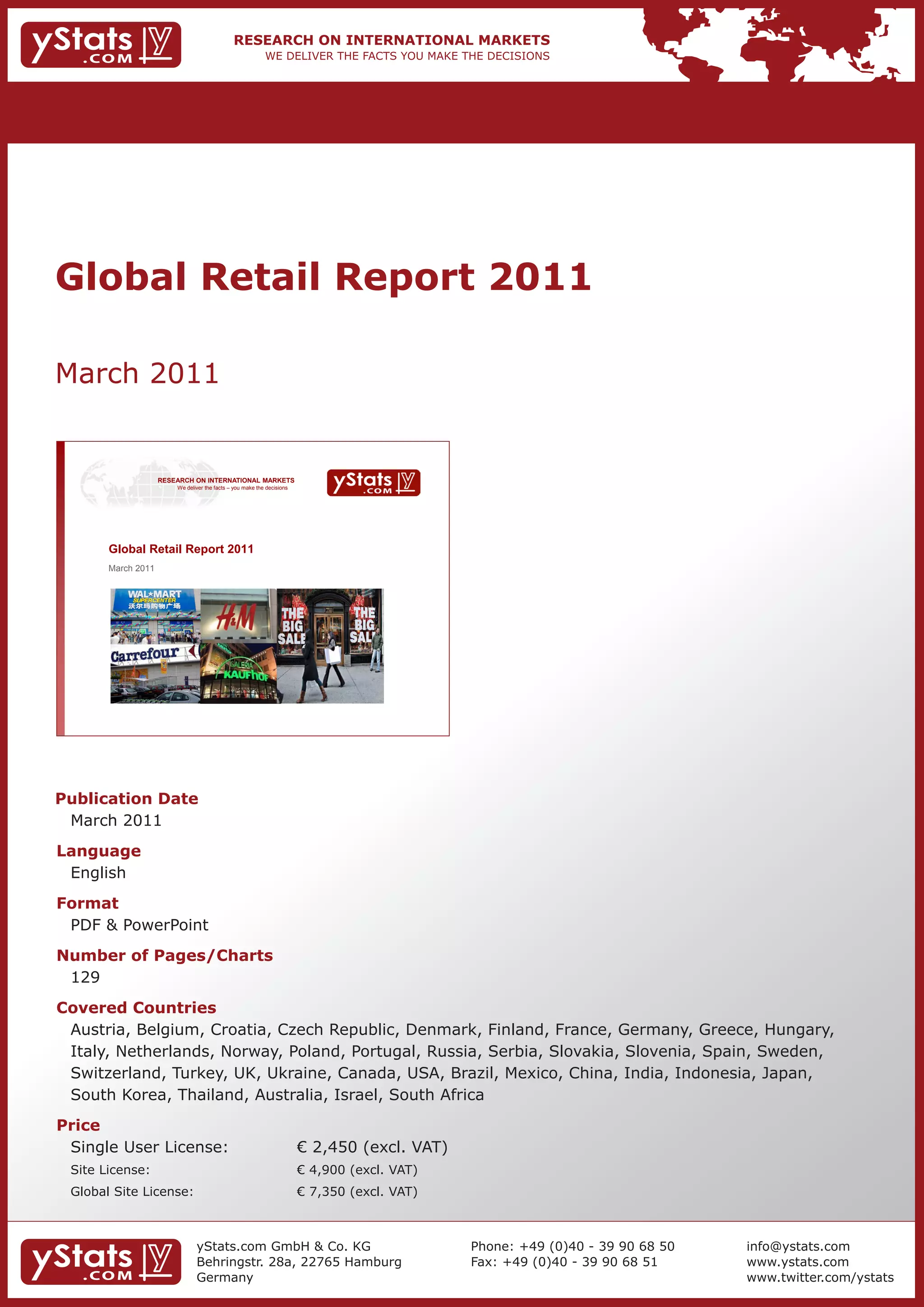 This 129-page report from yStats.com provides an overview of retail market trends in 38 countries worldwide. It includes key findings on retail sales figures and growth forecasts for countries like the US, China, Germany, and Brazil. The report also examines trends in sectors like e-commerce, discount retail, and consumer goods. It aims to inform strategic decisions by providing secondary market research data in an objective manner.