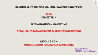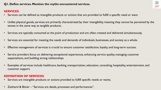 The document discusses the concept of services marketing, defining services as intangible products focused on fulfilling specific customer needs. It explores the evolution of service marketing, highlighting the transition from traditional views to a customer-centric approach in a service-driven economy, and underscores the importance of managing customer experiences. Additionally, it addresses the growth of the service environment, traditional and augmented marketing mixes, and the gap model for improving service quality.