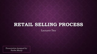 The document outlines the retail selling process, emphasizing personal selling as a costly yet effective advertising method. It details the key steps involved in the selling process including product knowledge, prospecting, needs evaluation, and follow-up, highlighting the importance of understanding customer needs and the benefits of the product. Additionally, it stresses the significance of closing sales and maintaining long-term relationships through consistent follow-up.