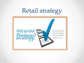 This document discusses retail strategy and the strategic retail planning process. It defines retail strategy as a marketing plan that details how a business will offer products to consumers and influence purchases. It then discusses key aspects of retail strategy including competitive advantage, the retail marketing mix, and the sustainable competitive advantages of customer loyalty, location, distribution systems, unique merchandise, vendor relations, and customer service. Finally, it outlines the six steps in the strategic retail planning process: 1) developing the mission, 2) establishing objectives, 3) situational analysis, 4) identifying strategic alternatives, 5) selecting the target market, and 6) obtaining resources needed to compete.